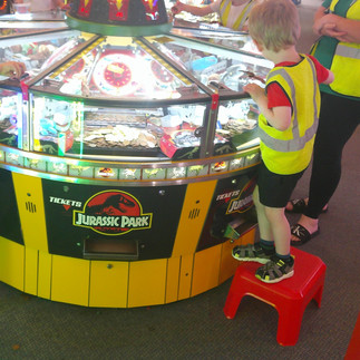 In the morning, we built a HUGE train track — working together to connect it from one end of the room to the other! Afterward, we walked to the arcade for some exciting 2p machine action and explored the games. A well-earned biscuit break followed, with our cuddly friend Rocky the teddy leopard joining us too!